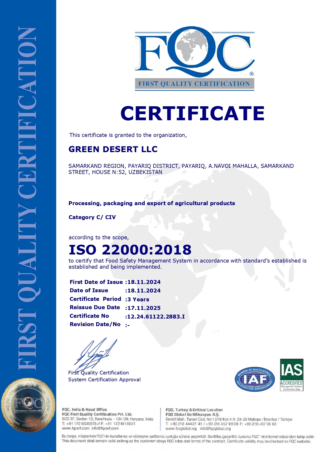 EcoFruit гордится тем, что предлагает высококачественные сухофрукты и орехи, выращенные на плодородных землях Узбекистана. Каждый продукт тщательно собирается и обрабатывается в соответствии со строгими стандартами контроля качества, что гарантирует, что наши предложения не только вкусны, но и соответствуют мировым нормам здравоохранения и безопасности.